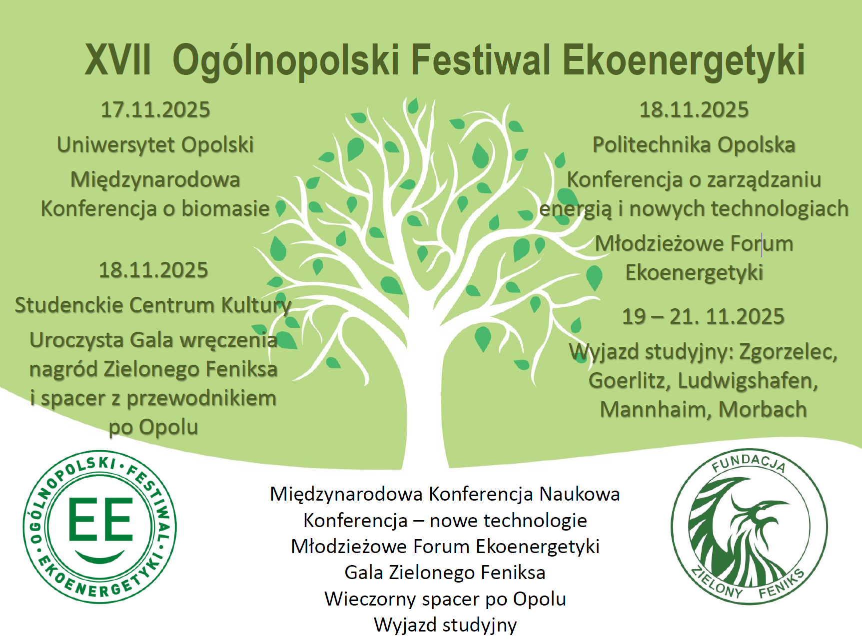 Fundacja na Rzecz Rozwoju Ekoenergetyki „Zielony Feniks” oraz Patroni – Komisja Europejska – Przedstawicielstwo Polsce, Marszałek Województwa Opolskiego, Marszałek Województwa Zachodniopomorskiego, Marszałek Województwa Pomorskiego, Opolskie Centrum Rozwoju Gospodarki, Aglomeracja Opolska, Gmina Baborów, WFOŚiGW w Opolu, Mazowiecka Agencja Energetyczna, Śląski Związek Gmin i Powiatów oraz Wydział Przyrodniczo-Techniczny Uniwersytetu Opolskiego organizują w dniach 17-21 listopada 2025 r. siedemnastą edycję Ogólnopolskiego Festiwalu Ekoenergetyki.